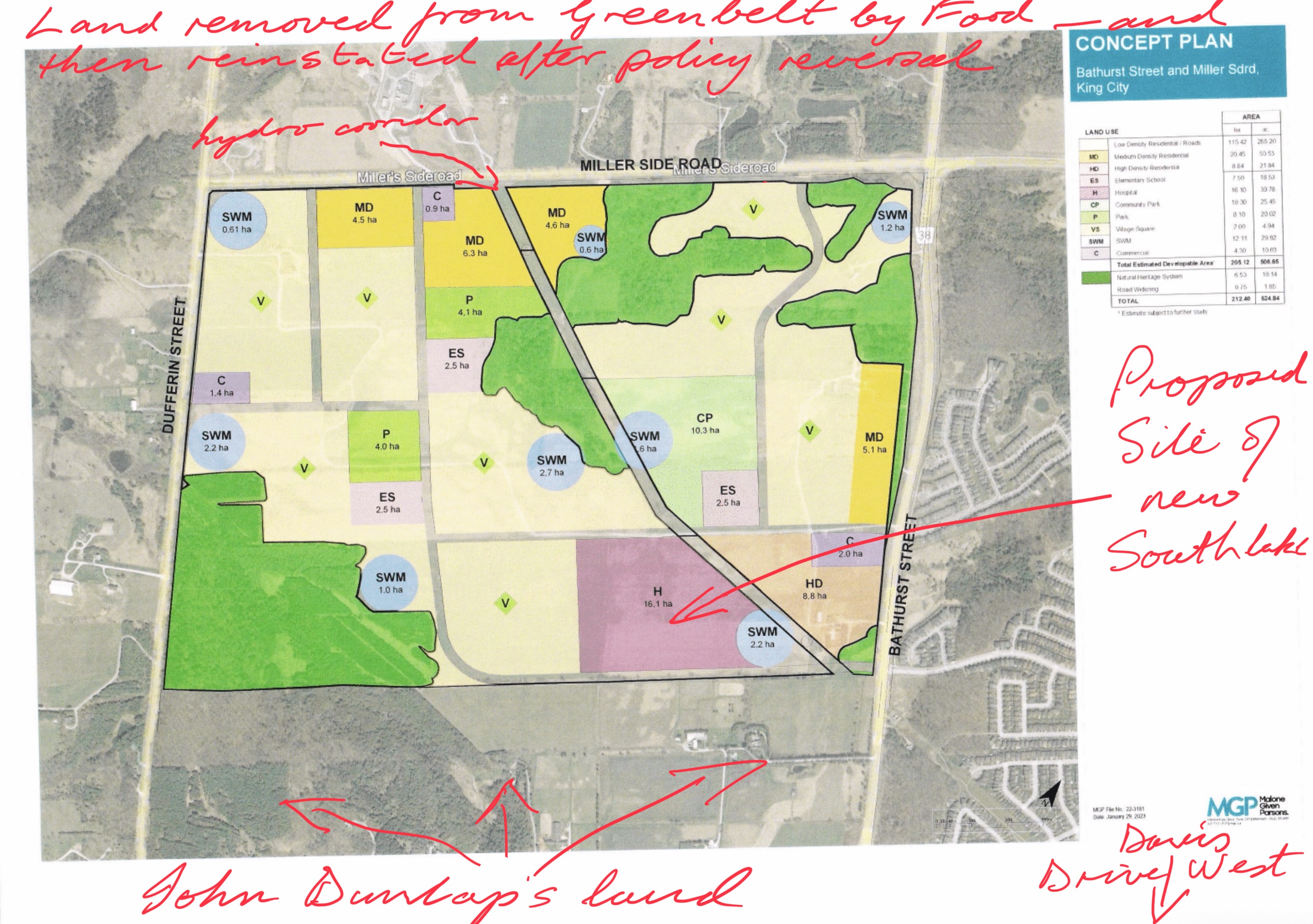 The “Concept Plan” (above) shows the preferred location of the proposed new Southlake acute hospital on the Bathurst lands following Premier Doug Ford’s decision – now abandoned - to open parts of the Greenbelt for development. It is dated 29 January 2023.