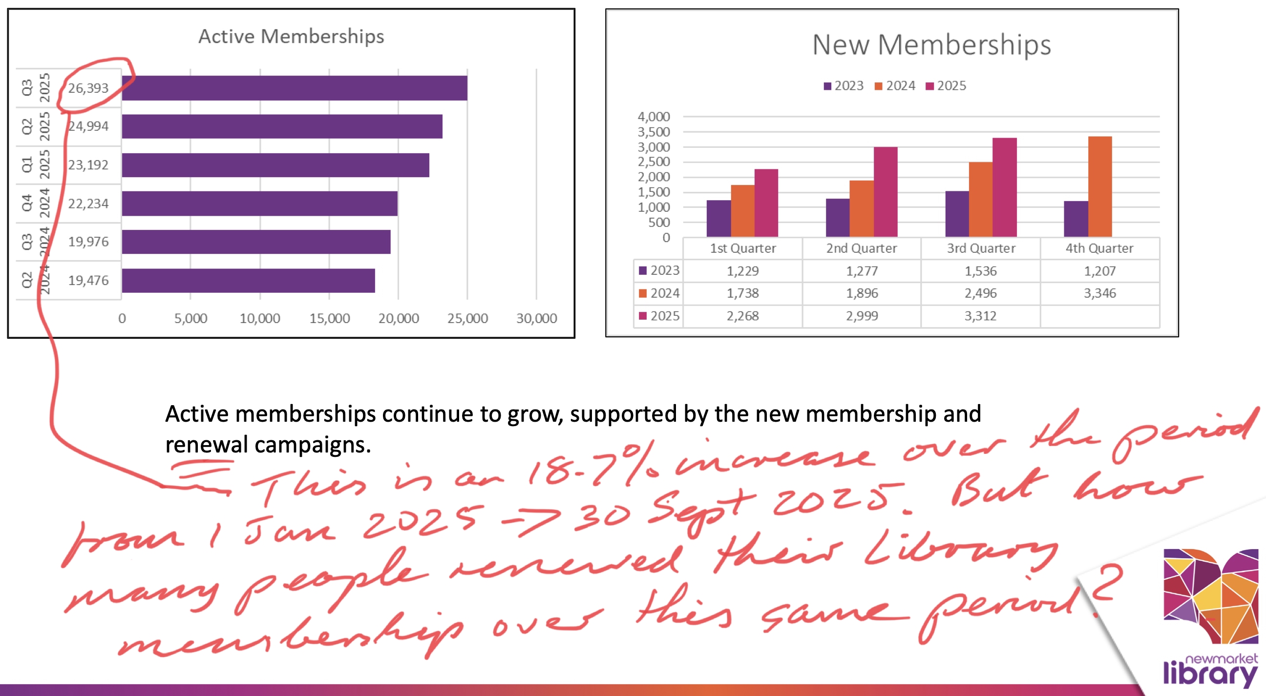 Note: The Table above (NPL Membership 2020-September 2025) shows the active membership number for 2023 as 18,992. The Ontario Annual Survey if Public Libraries figure shows 24,136 for 2023. On 11 April 2025 NPL's Chief Executive revised the number she had previously filed with the Provincial authorities. As of today's date, the incorrect figure (24,136) is still shown on the Ontario ASPL website in the section on 2023 statistical reports. (Scroll to Selected Population Group 50,001-100,000 and identify Newmarket.)